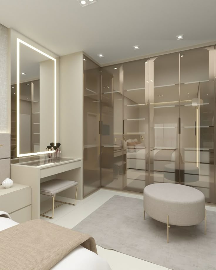 Um closet grande se torna quase um cômodo exclusivo para cuidados pessoais, transmitindo conforto e organização.