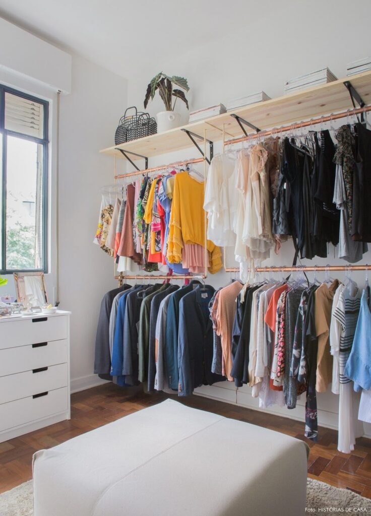 Integração com o quarto: muitas vezes, o armário simples é aberto, sem divisórias pesadas, formando uma extensão natural do ambiente.